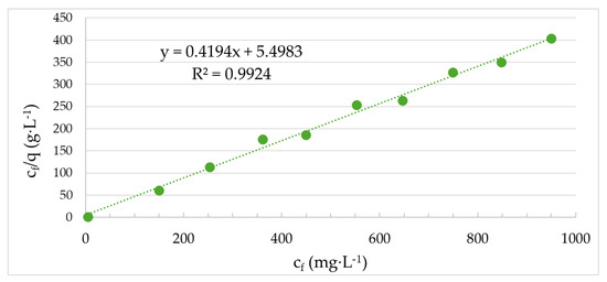 Figure 9. Linear Langmuir isotherm of Cd adsorption using bottom ash (Experimental conditions: cs = 20 g·L−1; 180 rpm; t = 23 ± 1 °C, without pH adjustment, contact time of 120 min, grain-size fraction <0.5 mm).