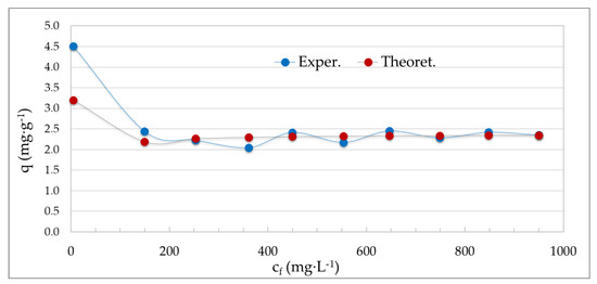 The non-linear dependence shows that the curves for both experimental data (blue curve) and theoretical data (red curve) have a similar shape. From the course of both curves, the bottom ash from the combustion of plant biomass will have a higher adsorption efficiency, especially for lower cadmium concentrations, which goes down to a half in case of higher concentrations. It is positive, however, that it can adsorb cadmium over a relatively wide concentration range, i.e., from 100 mg·L−1 to almost 1000 mg·L−1.