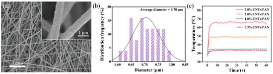 (a) SEM image of 3 wt% CNTs/PAN membranes. (b) Fiber diameter distribution of 3% CNTs/PAN membranes. (c) Optical heating capacity of CNTs/PAN membranes with different content of CNTs.