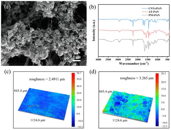 (a) SEM image of electrospray microspheres of 4% NIPAN@CNTs/PAN membranes. (b) FTIR spectra of 4% NIPAN@CNTs/PAN membranes. Three dimensional optical profilometer images of (c) CNTs/PAN and (d) 4% NIPAN@CNTs/PAN membranes.