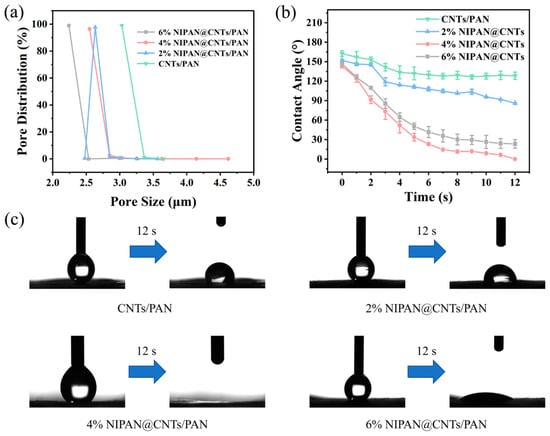 (a) Pore distribution and (b) time-varying water contact angles for CNTs/PAN and NIPAN@CNTs/PAN membranes with different NIPAN content. (c) Digital images for CNTs/PAN and NIPAN@CNTs/PAN membranes with different NIPAN content at initial and 12 s later.