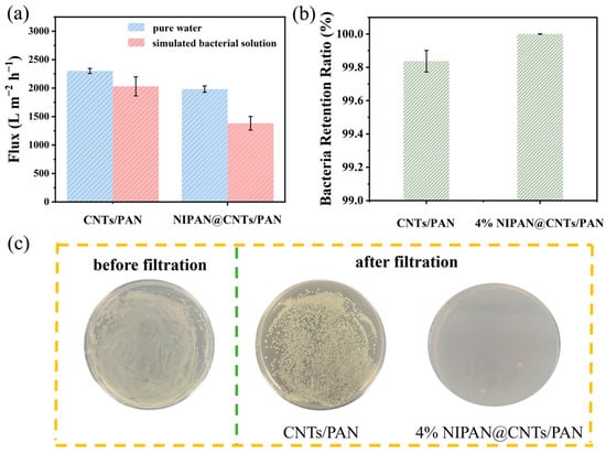 (a) Fluxes in water and simulated bacterial solutions and (b) retention ratio for both CNTs/PAN and 4% NIPAN@CNTs/PAN membranes. (c) Digital images expanded 20 h before and after filtration for both CNTs/PAN and 4% NIPAN@CNTs/PAN membranes.