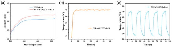 (a) UV-vis-NIR spectra of CNTs/PAN and 4% NIPAN@CNTs/PAN membranes. (b) Optical heating capacity of 4% NIPAN@CNTs/PAN membranes. (c) Cycling temperature curve of 4% NIPAN@CNTs/PAN membranes.
