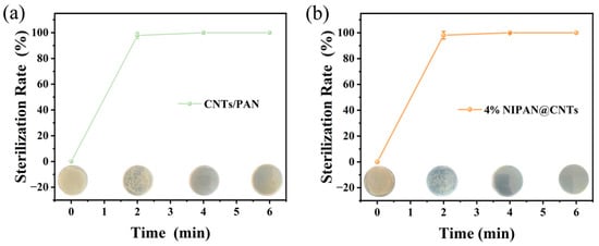 Sterilization rates upon NIR irradiation at different time for both (a) CNTs/PAN and (b) 4% NIPAN@CNTs/PAN membranes.
