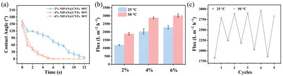 To explore the impact of the thermosensitive substance NIPAAm on the membrane’s flux, it was essential to analyze changes in the water contact angle over time both above and below the LCST for the three composite fiber membranes with different NIPAN electrospray concentrations. The contact angle changes above the LCST were subsequently measured for each material. As shown in Figure 7a, all three NIPAN@CNTs/PAN membranes displayed enhanced hydrophilicity at 50 °C compared to 25 °C (Figure 3b). For instance, with the 4% NIPAN@CNTs/PAN membrane, the contact angle rapidly decreased from an initial 143° to 91° within 2 s at 25 °C. At 50 °C, however, the contact angle dropped even more drastically, from 146° to 44° within 2 s, indicating superior hydrophilicity. Although temperatures above the LCST, such as 50 °C, cause NIPAN chains to collapse and expose their hydrophobic ends, theoretically reducing liquid wettability, elevated temperatures also increase the kinetic energy of water molecules, thereby raising intermolecular forces and decreasing surface tension—factors that enhance wettability and lower the contact angle. Additionally, the NIPAN collapse at higher temperatures may contribute to slight increases in surface roughness, further promoting hydrophilicity. This indicates that the combined hydrophilic effects—arising from chemical interactions, kinetic forces, and morphological changes of NIPAN at elevated temperatures—outweigh the hydrophobic effect introduced by the exposure of hydrophobic ends.