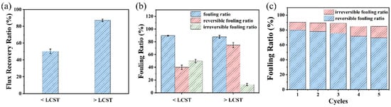 (a) Fluxes recovery ratio (FRR) of 4% NIPAN@CNTs/PAN membranes below LCST and above LCST. (b) Fouling ratio (Rt), reversible fouling ratio (Rr) and irreversible fouling ratio (Rir) of 4% NIPAN@CNTs/PAN membranes below LCST and above LCST. (c) Cycling antifouling tests of the 4% NIPAN@CNTs/PAN membrane.