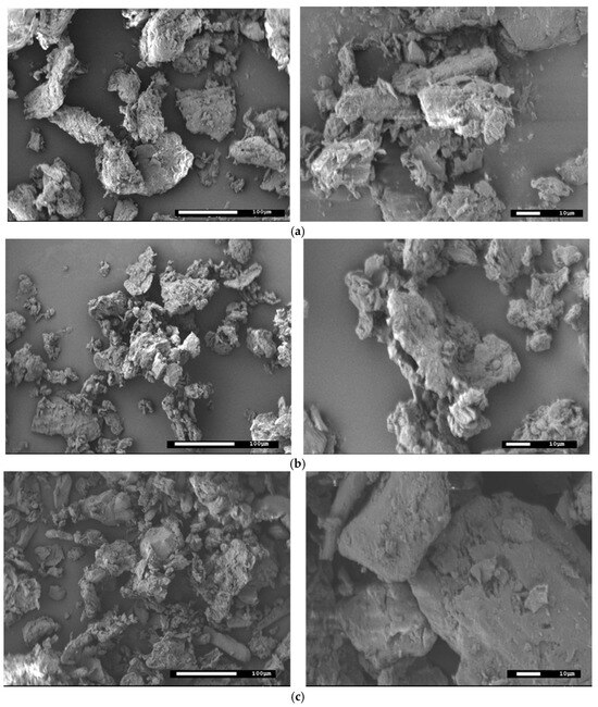 In Figure 3, the SEM images of H2O-pre-treated adsorbent materials are shown. The three biomasses consist of particles with irregular shapes and varying size distributions, with lengths up to approximatively 100 μm. Since the morphology of the dry and HNO3 pre-treated samples did not exhibit significant differences, they are not included in this figure. In the literature, various authors have observed heterogeneous surfaces and irregular geometries in both original and NaOH-modified citrus (e.g., lemon, orange) [38,39,51,54,55,58,59], grape pomaces [43], and olive mill wastes [31,39]. In olive pomace, Ali et al. [30] individuated porous structures with surface cavities possibly capable of interacting with contaminants. Only a few of these studies reported data on particle size distribution. Fernández-López et al. [39] identified packed and porous patterns of around 70 μm in both olive mill residue and citrus waste, and Zannini [61] and colleagues measured sizes of 50 μm in citrus pectins, while Melia and coworkers reported a size of 100 μm in grape pomaces. Titone and colleagues [56] observed structures with irregular shapes and varying sizes in the interval between a few microns and 200 µm in grinded grape pomace samples. Kaya and coworkers [41] identified particles both smaller than 1 μm and those larger than 100 μm in olive pomaces. Villen-Guzman’s group [58,59] observed sizes of approximately 10–20 μm in both unmodified lemon peels and NaOH pre-treated samples. They also noted variations in morphological and surface structure after alkaline chemical treatment, likely due to increased adsorption capacity.