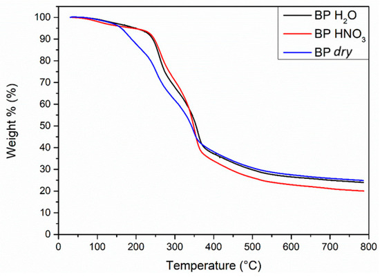 The TGA thermograms for all samples always showed several not-well-resolved weight loss steps. Figure 4 depicts the thermal behaviour of bergamot pomace samples. The decomposition of dry BP (blue line in Figure 4) showed the occurrence of five weight loss steps in the temperature ranges 30–120 °C (with a weight loss of 1.7%), 120–210 °C (12%), 210–300 °C (24%), 300–410 °C (25%) and 410–600 °C (10%) (Table 3). After the last step, the weight stabilised around 25%. Upon the pre-treatment with H2O and HNO3, the BP samples (black and red lines for BP H2O and BP HNO3, respectively, in Figure 4) displayed the occurrence of four weight loss steps. The behaviours of the two samples are quite similar to each other, with 4.7–4.9% and 28.7–23.5% weight losses in the first two intervals (t = 30–190 °C and 190–300 °C), as well as 30% and 38% (temperature range 300–412 °C) for BP H2O and BP HNO3 in the third step, respectively. Lastly, (t = 412–610 °C or 412–560 °C, for the two samples, respectively) a weight loss of 9.8 and 8.9% was observed for the two samples, respectively. After the last step, the weight stabilised at 24% and 20% for BP H2O and BP HNO3, respectively (Table 3).