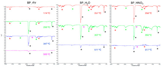 The FT-IR analysis of the evolved gas during the TGA of bergamot pomaces is reported in Figure 5, while analyses for OP and GP samples are shown in Figures S5 and S6. All the samples evolved with CO2 (black stars) and water (red stars), which were retrieved basically in all steps. The mixture of gasses were enriched in formaldehyde (green stars), above t = 240 °C, and CO (magenta stars), starting from above t = 300 °C.