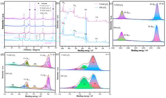 2.5 mM cobalt nitrate, 1.5 mM zinc nitrate, 9 mM urea, and 12 mM ammonium fluoride, along with varying concentrations of V2O5 (0, 0.3 mM, 0.5 mM, 0.8 mM). These reagents were sequentially added to 40 mL of deionized water and stirred thoroughly to dissolve. The pre-treated nickel foam was immersed in this solution and heated at 120 °C for 6 h. The resulting precursor was then calcined at 350 °C for 2 h to obtain the ZnCo2O4 samples, which were named V−ZnCo2O4−1, V−ZnCo2O4−2, and V−ZnCo2O4−3 according to the V content.
