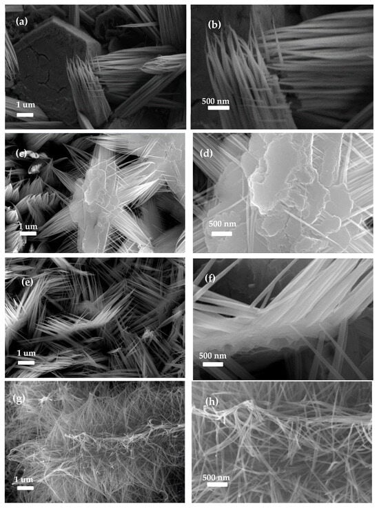 SEM images of ZnCo2O4 with different V doping levels. (a,b) are the scanning morphologies of ZnCo2O4; (c,d) are the scanning morphologies of V−ZnCo2O4−1; (e,f) are the scanning morphologies of ZnCo2O4−2; (g,h) are the scanning morphologies of ZnCo2O4−3.