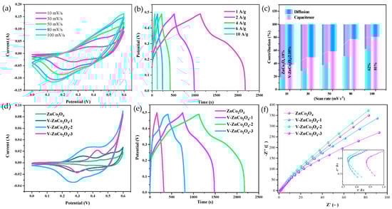 Electrochemical properties of the samples. (a) CV curves of V−ZnCo2O4−2 at different scanning rates; (b) GCD curves of V−ZnCo2O4 at different scanning scans; (c) Capacity Contribution Ratio; (d) CV curves of different samples at the same scanning rates; (e) GCD curves of different samples at the same current density; (f) Nyquist plot.