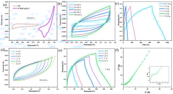Performance of V−ZnCo2O4−2//AC asymmetric supercapacitor. (a) Capacitor operating voltage; (b) CV curves at different scanning rates; (c) GCD curves at different current densities; (d) CV curves at different voltages; (e) GCD curves at different voltages; (f) Nyquist plot.