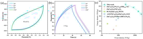 To further investigate the mechanical properties of the material, we bent the material to a certain angle and measured its electrochemical performance. As shown in Figure 5a, the material was bent to angles of 30°, 60°, 90°, and 150°, and the CV curves were measured at a scan rate of 50 mV/s. The results show that from 30° to 150°, the CV curves remain unchanged, indicating that the material possesses excellent mechanical properties and retains good electrochemical performance under significant mechanical deformation. Figure 5b shows the GCD curves of the material at different bending angles, with the position of the curves remaining largely unchanged, further confirming the mechanical performance of the material. Based on the GCD curves of the material, we calculated and plotted the Ragone plot (Figure 5c). The curves correspond to the energy density and power density calculated for different materials [31,32,33,34,35]. For the V−ZnCo2O4−2//AC system, the calculated energy densities are 127.5 Wh/kg, 114.75 Wh/kg, 99 Wh/kg, and 87.75 Wh/kg, with power densities of 2700 W/kg, 8100 W/kg, 16,200 W/kg, and 24,300 W/kg, respectively. It is evident that the asymmetric capacitor composed of V−ZnCo2O4−2//AC exhibits higher energy and power densities compared to supercapacitors made from other materials, which demonstrates the practical value of this material to a certain extent.