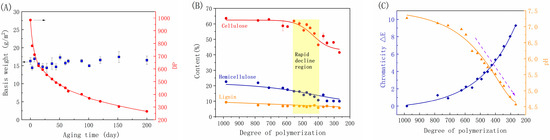 Variations in basic weight and DP as a function of aging time for bamboo paper (A); variations in chemical composition (B) and chromaticity ΔE and pH (C) with the decrease in DP under an accelerated dry-heating treatment at 105 °C.