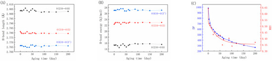 Figure 3 depicts the alterations in hydrogen bond lengths and energies between and within cellulose molecules during the paper-aging process. As shown in Figure 3A,B, both intramolecular and intermolecular hydrogen bond energies increase throughout the aging process, with intermolecular hydrogen bonds displaying a more pronounced change. In the initial 40 days of aging, the bond length of intermolecular hydrogen bonds gradually decreases, indicating a potential movement of cellulose molecular chains toward each other. Subsequently, the bond length increases and stabilizes, fluctuating within a narrow range until day 200. The decrease in intramolecular hydrogen bond length and the increase in bond energy suggest possible contraction or distortion of molecular chains of cellulose due to the prolonged dry-heat treatment. Conversely, the intermolecular hydrogen bonds exhibit a significant decline followed by recovery, suggesting a potential rearrangement process of hydrogen bonds [40] that accompanies the decrease in the paper’s cellulose DP. In the first plateau region of the paper’s mechanical properties, despite the sharp decrease in DP, the increased hydrogen bond energy may strengthen the bonding between fibers, thereby mitigating the decay of the mechanical properties. In other words, while the cellulose molecular chains may experience breakage and make the fibers brittle, the enhanced strength of hydrogen bonds within the internal fiber network of the paper reinforces the binding between fibers and may lead to irreversible hornification.