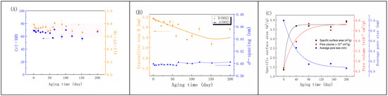 Figure 5C illustrates the variation in pore parameters in paper fibers during the thermal drying process. In the early stages of aging, the specific surface area rapidly increases and stabilizes after 40 days, indicating that the fiber surface becomes rougher and more porous. The pore volume also shows a similar trend but with a slower growth rate, possibly due to the combined effect of pore size and quantity. In contrast, the average pore diameter gradually decreases as aging progresses, implying a contraction of the internal pore structure of the fibers. As the average pore size decreases while the pore volume increases, this indicates an increase in the number of pores. This may be attributed to the rapid breakage and degradation of cellulose molecular chains in the early stages of aging, leading to the formation of porous fibers. However, after 80 days of aging, the pore volume and average pore diameter of the fibers show a tendency to stabilize, indicating that the pore structure has reached a stable state. The average pore size does not further decrease, suggesting that the fibers maintain a relatively stable structure in the later stages of aging. Combining the previous discussion, this may be due to hemicellulose and lignin hindering cellulose aggregation and co-crystallization, maintaining the stability of the fiber skeleton structure. This phenomenon has also been reported in thermal treatment processes [43].