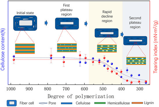 The aging behavior of bamboo paper is highly complex due to the presence of a certain proportion of hemicellulose and lignin in addition to cellulose in its chemical composition. As mentioned earlier, the mechanical properties exhibit three regions with respect to DP: the first plateau region, the rapid decline region, and the second plateau region (Figure 6). The DP of cellulose significantly impacts the mechanical properties of paper, and there is a similar trend between the cellulose content and the DP. It is evident that oxidative degradation dominates due to the significant decline in DP [23], leading to the speculation that fiber embrittlement may play a more significant role in the first plateau region than the deterioration of fiber–fiber bonds. It is commonly believed that the degradation of cellulose leads to chain breakage, reducing the inter-fiber bonding force and, thereby, decreasing the mechanical properties of paper. However, this study demonstrates that despite a significant decrease in cellulose DP, which would normally lead to brittleness in the initial plateau stage of fiber degradation, this brittleness does not significantly impair the mechanical performance of the paper. This may be attributed to the role of hydrogen bonds, as the strength of paper in the first plateau region remains unchanged. Additionally, the decrease in the WRV indicates the appearance of irreversible bonding in the paper, with some hornification occurring. The rearrangement of hydrogen bonds and hornification may compensate for the impact of cellulose chain breakage on mechanical strength. These hydrogen bonds, which are formed via free hydroxyl groups, create strong bonds within the fibers that are, to some extent, irreversible. The resulting multiple hydrogen bond structures are highly stable and not easily disrupted [48]. Additionally, the formation of ester bridges between cellulose molecular chains, which are covalent bonds and irreversible in water, contributes to hornification [49]. These various mechanisms may all contribute to the hornification process and potentially interact with each other. For instance, functional groups within the cellulose chains may engage in hydrogen bonds, ester bonds, ether bonds, and other types of bonding interactions. It is important to note that hornification is not entirely detrimental. This study suggests that moderate hornification can be strengthened by the hydrogen bonds between cellulose molecules, thereby enhancing the binding between fibers, helping to preserve the mechanical properties of paper, and preventing a sharp decline in the initial stage. It is important to note that the decrease in cellulose DP does not occur simultaneously with the decrease in cellulose content. During the aging process, cellulose chains may break, forming shorter chains, but this does not immediately reduce the total cellulose content. There may also be recombination of chains, keeping the total cellulose content relatively stable for a certain period of time.