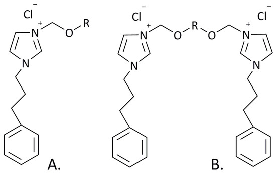 Molecular structures of synthetized monocationic (A) SAILs, where R = C7H15, C8H17, C9H19, C10H21, or C12H25, and dicationic (B) SAILs, where R = C7H14, C8H16, C9H18, C10H20, or C12H24.