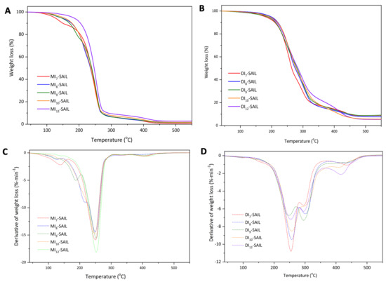 TG (A,B) and DTG (C,D) curves for a series of synthesized ionic liquids: (A,C) MIn-SAIL; (B,D) DIn-SAIL (where n = 7, 8, 9, 10, and 12).