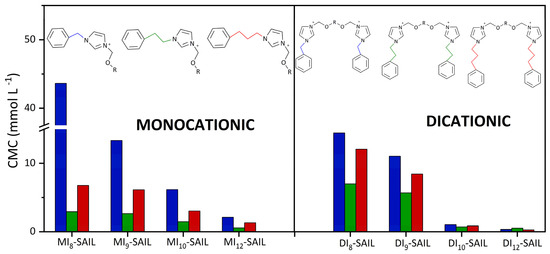 To highlight the comprehensiveness of the research on the synthesized compounds, a summary is provided (see Figure 4) that compares the CMC values of the series of imidazolium SAILs studied so far.