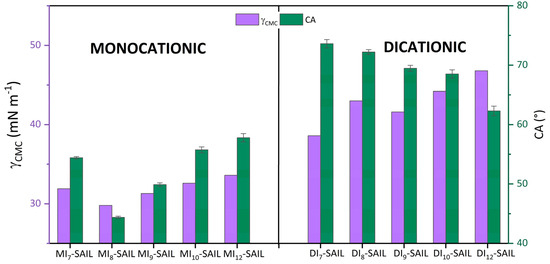 Focusing on the discussion of the wettability of the synthesized SAILs, it is necessary to cite the ranges of CA values by which the compounds are classified. Accordingly, CA values in the range from 0° to 90° refer to compounds that partially wet the surface under study. For monocationic SAILs (from 44.38° to 57.79°) and dicationic SAILs (from 62.31° to 73.61°), the CA value falls within the indicated range. Continuing with the interpretation of the degree of wettability of the compounds, Figure 5 compares the values for CA with those for the parameter γCMC.