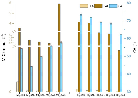 To ensure clarity in the analysis of the results, we structured our discussion according to the size of the amphiphilic part in the SAILs’ structures. Interestingly, in the case of monocationic SAILs, a similar parabolic tendency was observed. According to microbiological studies, this phenomenon is associated with the cut-off effect [68]. Nevertheless, the lowest CA value was obtained for MI8-SAIL, while the lowest MIC value was recorded for MI10-SAIL. Although it is not possible to distinctly identify a single potentially best-performing compound among all monocationic SAILs as part of a commercial surface-active formulation with biocidal action, this does not change the fact that the synthesized SAILs represent an interesting group, and research on them should be continued in the future. In contrast, for dicationic SAILs, a different trend was observed. In their case, as the degree of wettability increases, the antimicrobial activity of the compounds also increases, but only for bacterial species. Vallapa et al. [69] highlighted a similar tendency in their analysis of biological materials. Their speculation is important from an application point of view, as the larger the range of action of the compound, the more effective the product containing the given SAIL becomes.