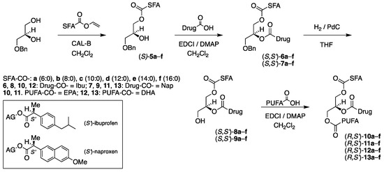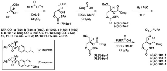 Chemoenzymatic synthesis of the first category TAG prodrug diastereomer series (S,S′)-10a–f–13a–f, starting from 1-O-benzyl-sn-glycerol. In the scheme, SFA-CO-, PUFA-CO- and Drug-CO- refer to the corresponding saturated fatty acyl, polyunsaturated fatty acyl and drug acyl group substituents, respectively. In box: (S′)-ibuprofen and (S′)-naproxen attached as esters to acylglycerols (AG).