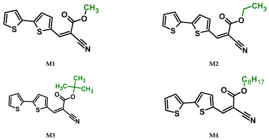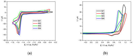 In the case of reduction, the behavior of the molecules is typical for this type of derivative [35,36]. As one can see, a reduction is irreversible (from the thermodynamic point of view), with a distinct wave and almost identical peak onset values for all compounds, i.e., between −1.43 V and −1.47 V (see Table 3). This means that the electron density within the cyanoacrylate group is approximately similar, which is also consistent with the results predicted using the DFT calculations. In the case of oxidation, some differences can be noticed. For compounds with small-sized substituents (M1 and M2), oxidation occurs when the potential is almost as high as 1 V (0.97 V and 0.99 V, respectively). Meanwhile, for derivatives M3 and M4, this process occurs at 0.84 and 0.82 V. These differences directly affect the electrochemically determined energy gap, which is lower for the last two investigated compounds.