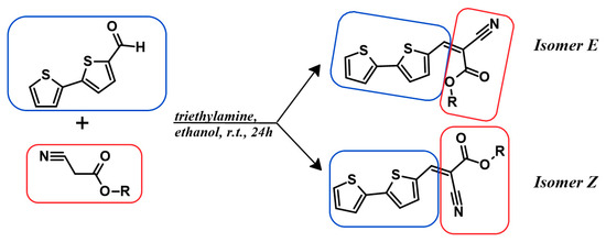 The studied derivatives were obtained by direct Knoevenagel-type condensation (Figure 2). An NMR analysis is extremely useful in this case because the substrate is an heteroaromatic aldehyde—the aldehyde hydrogen is characterized by a peak of about 9–10 ppm, i.e., a range in which there are few other groups (for this particular aldehyde, the signal appears at 9.8 ppm). As one can see in Spectrum S1 (see SI), the reaction resulted in a quantitative conversion of the aryl substrate. On the other hand, the theoretical (main) products of such a reaction are E and Z isomers differing in the configuration of substituents at the newly formed double bond (Figure 2). The key to the analysis is the peak originating from vinyl hydrogen (–CH=C–). It is worth noting that already on the basis of the study of this peak, a shift is visible within the series (between 8.19 and 8.27), which means that there are some differences in the distribution of electron density. On the other hand, the reaction is highly selective—only the E isomer is formed. DFT calculations were found to be useful in explaining this issue (see Table 1). In the case of the formation of the E isomer, there is additional intramolecular stabilization–hydrogen bonding, i.e., an interaction between the oxygen of the ester group and the hydrogen located at carbon 4 of the bithiophene ring.