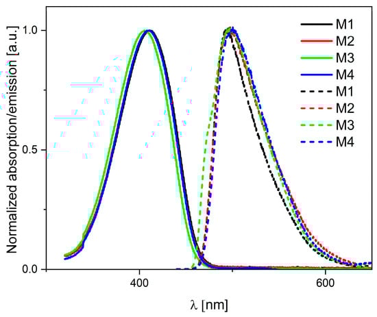 In the next stage, measurements were performed using UV-vis and PL spectroscopy for diluted (c = 10−5 mol·dm−3) solutions in dichloromethane (Figure 4). When analyzing the obtained UV-vis spectra, it can be seen that all compounds tested exhibit maximum absorbance in a similar range of 410–420 nm. The highest molar absorption coefficient is observed for compound M4, i.e., a derivative with an octyl substituent. We also observe a slight hypsochromic shift, i.e., towards shorter wavelengths, caused by ester substituents (COOR) relative to the malononitrile derivative [35]. The tested compounds showed similar behavior when examining photoluminescence for dilute solutions. All of them emitted light at a wavelength of 493 nanometers with emission quantum yields between 0.7% (M4) and 3% (M1). The Stokes shifts are also almost equal (83–90 nm) for the entire series of investigated molecules (see Table 4).