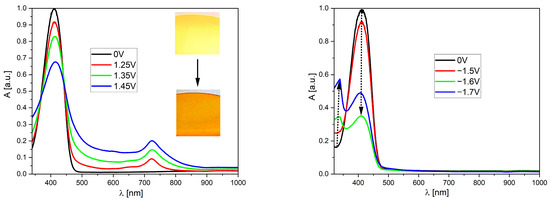 The UV-vis spectroelectrochemistry of the studied derivatives in the dichlorometane solution (c = 1 × 10−5 mol/L, as an inset on each graph, all potentials vs. the Fc/Fc+ redox couple). Selected spectra were recorded during the oxidation of the M1 derivative (left), and there was a reduction in the M2 derivative (right). As the inset in the spectrum, there are pictures of the compound in neutral form and after oxidation. The dotted arrow indicates changes in peak intensity.