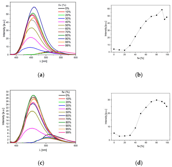 Emission spectra (a,c) and fw vs. fluorescence plot (b,d) for M1 (top) and M2 (bottom) in mixtures of DMF and water (c = 1 × 10−5 mol/L).