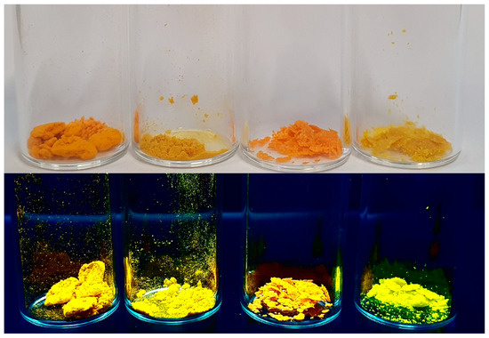 Pictures of investigated compounds (from left, M1, M2, M3, and M4) in daylight (top) and during 366 nm light irradiation (bottom).
