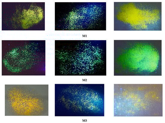 As mentioned earlier, compounds exhibiting aggregation-enhanced emission (AIE) are excellent candidates for latent fingerprint (LFP) detection due to their hydrophobic nature and optical properties. Above is a summary of LFP detection for three different subsoils for four compounds, M1–M4, under UV light (As can be seen at first glance, the best surface turned out to be metal, whereas for all four compounds, it was possible to obtain an image with partially visible minutiae (a close-up picture of minutiae is provided in Figure 9). However, the image for compound M1 is the best due to it having the most visible minutiae. Looking at the second substrate, which is plastic, only the image for compound M4 is the most promising due to the visible confirmation of contact with the surface and very few minutiae, which cannot be observed in the case of the other compounds. The last subsoil used was ceramic. In this case, compounds M1, M2, and M4 strongly interacted with the substrate, causing a lack of background separation from the image, which can only confirm contact with the subsoil without more information (see Figure 10).