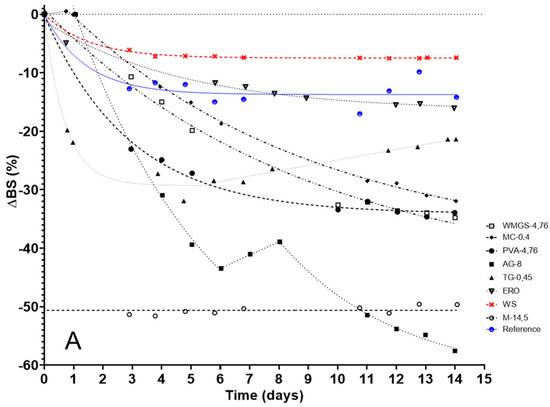 The curves corresponding to pregel-containing seed film-coatings are shown in blue for all investigated substitutes. ΔBSaverage is higher for seed film-coating formulations containing pregel, except for PVA-4.76 and ERO-10. A higher ΔBS means that the addition of pregel reduces the number of particles migrating from the supernatant phase.