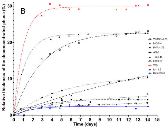 With regard to the relative mean thickness of the supernatant phase, it increases at a slower and less pronounced rate when the seed film-coating contains a substitute. The exponential increase in ec was observed for all samples, with the exception of substitute ERO-10, where ec exhibited an initial exponential increase up to two days of aging, followed by a linear increase.