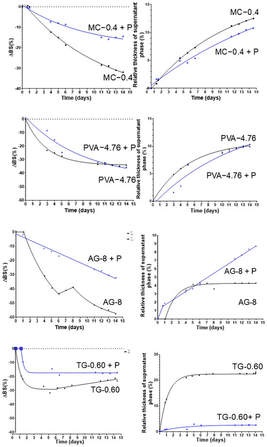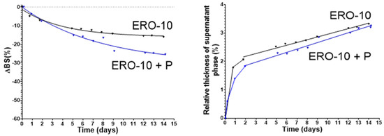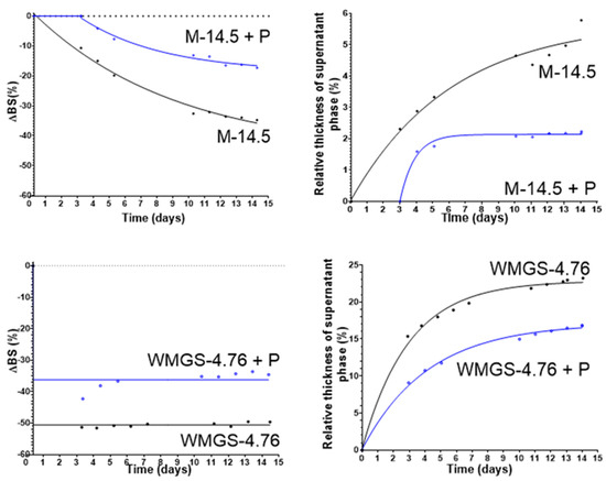 The values displayed subsequently correspond to ΔBS, the variation in backscattered light flux. Please refer to the Supplementary Materials for further details (Figure S1). Photographs of two samples (M14.5 and M14.5 + P) during the accelerated aging are also shown in the Supplementary Materials (Figure S2).