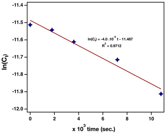 Varying naproxen concentrations with time were studied, where the degradation process best fits the pseudo-first order reaction kinetics equation (ln(Ct) = −4.0 × 10−5 t − 11.487) with a determination coefficient of 0.9712, as modeled by Equation (2) and as illustrated by Figure 3 [37].
