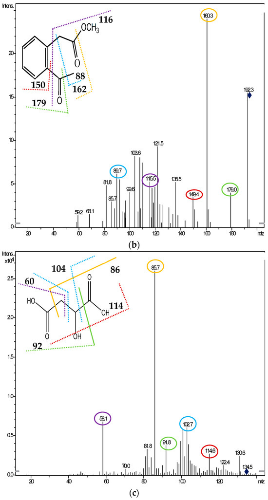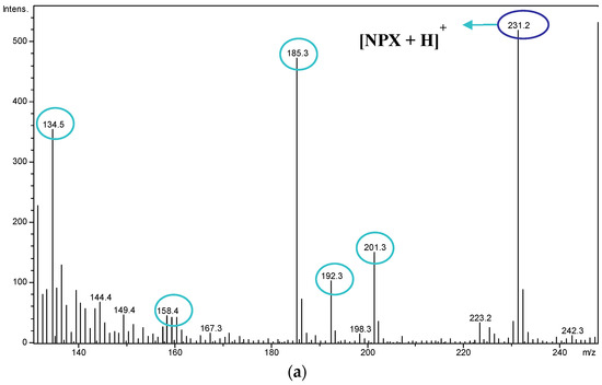 (a) MS spectrum of naproxen and its detected degradation products at the 1 h timestamp. (b) MS/MS spectrum confirming the 192 fragment’s structure. (c) Tandem mass spectrum of another naproxen degradation product (m/z = 134).