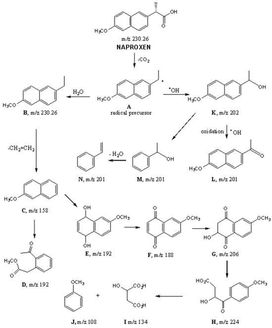 Degradation pathway of naproxen mediated by hydroxyl radicals.