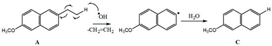 Consequently, the removal of naproxen from wastewater, before it reaches water bodies and sources, is a priority [7]. Naproxen is not readily biodegradable but can be degraded under visible-light conditions in the presence of a photocatalyst [22]. There have been many studies regarding the photodegradation of naproxen with a diverse set of inorganic and nano catalysts [13,23,24,25,26,27,28]. Reduced graphene sheet functionalized with bismuth oxide silicates and carbon nitrides (rGO/BSO/g-C3N4) along with visible-light exposure of an hour and a half, resulted in an removal efficiency of 77.5% of naproxen from wastewater samples [29]. In another study nanosheets (Bi2MoO6/g-C3N4 with a 50/50 mass ratio) doped with molybdenum showed increased photodegradation efficiency of 83% [23]. A graphene sheet with carbon nitride as functional groups (g-C3N4) was used to photodegrade naproxen and its degradation products from LC-MS/MS studies, included 2-methoxy-6-vinylnapthelene, 2-(napthalen-2-yl)propanal, and 1-(6-methoxynapthalen-2-yl)ethan-1-one [27]. TiO32− nanobulks altered with bismuth was effective in removing naproxen at a pH of 7 with about 99.9% efficacy [24]. A nano heterocomposite catalyst of gamma-iron oxyhydroxide (γ-FeOOH) was used in conjunction with a UV photochemical reactor with an optimized pH of 5, displaying first-order kinetics, and by-products of dimethyl benzene-1,2-dicarboxylate, 2-propylbenzoic acid, 1-methoxy-6-methylnapthalene, succinic acid, among others [28].
