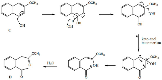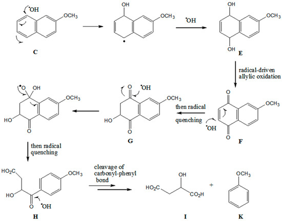 Reactive hydroxyl (·OH) radicals, produced by the catalyst in the presence of light and oxygen molecules, caused the degradation of naproxen as evidenced by the UV-Vis studies and LC-MS/MS analysis. Various intermediates were produced, and their structures were confirmed by MS/MS. Based on these structures, a degradation pathway is proposed (Scheme 1). The initial event seems to be the hydroxyl radical decarboxylation of naproxen to give a stable benzylic radical A from which fifteen intermediates were produced. The quenching of A with water and hydroxyl radicals led to the intermediates B and K, respectively. Intermediate B underwent the loss of ethylene, through a radical process, to produce the degradation product C. The mechanism for the conversion of B → C is proposed (Scheme 2). The methoxy-bearing compound C then undergoes a ring opening to produce the structure D. A plausible mechanism for the C → D transformation involving a series of hydroxyl radical attacks and keto-enol tautomerism is given in Scheme 3. Intermediate C also undergoes oxidation to the dehydroxylated compound E, which is further oxidized to the benzoquinone F, which subsequently goes through further hydroxylation to G, then the ring opens to H, and finally cleavage generates anisole J and hydroxy succinic acid I. The series of transformations from C → I + J are depicted in Scheme 4.