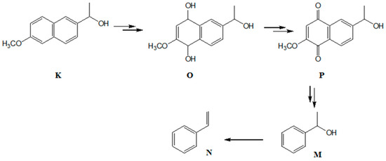 Under the reaction conditions, the alcohol compound K goes through a hydroxyl radical oxidation to provide the ketone L (Scheme 5). K is further degraded to the benzyl alcohol M, through the intermediates O and P, following a mechanism similar to that illustrated in Scheme 4, where the ring bearing the methoxy group is destroyed via oxidation to a benzoquinone intermediate. The elimination of water from the benzyl alcohol M then produces the styrene N.