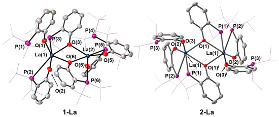 Compounds 1-La and 2-La both crystallised in the P-1 space group and displayed an analogous dimeric arrangement in the solid state, with two phosphinophenolate ligands bridging between the metal centres via the oxygen donor atoms (Figure 2). As a result, the La–O distances of bridging ligands [1-La: La–O 2.418(6)–2.526(5) Å; 2-La: La–O 2.458(2)-2.477(2) Å] were elongated slightly with respect to those of terminal donors [1-La: La–O 2.235(6)–2.250(6) Å; 2-La: La–O 2.255(2)–2.297(2) Å]. The distances between the metal centres and the coordinated phosphorus atoms for 1-La were larger than those for 2-La (Table 1), ranging from 3.223(2) Å to 3.459(3) Å for 1-La, and 3.1653(10) Å to 3.3466(7) Å for 2-La. Both metal centres in 1-La exhibited a six-coordinate distorted trigonal prismatic geometry; in each half of the dimer, one of the ligands acts as a monodentate O-donor, with the phosphorus atom positioned away from the metal centre [La···P 3.662(2) Å and 4.701(2) Å]. A similar arrangement was also observed for 2-La, but in this case, the geometry of each metal centre was trigonal prismatic, with an inversion centre position between the two La atoms. The distance between the non-coordinating P atom and the respective La centre for 2-La was found to be 3.4732(7) Å.