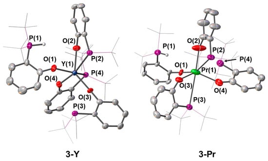 Complex 3-Y crystallised in the P-1 space group, with two of the four phosphorus donors not coordinating to the metal centre, one of which was the protonated phosphorus atom (Figure 4). The Y–P distances were in the range between 3.0963(11) Å and 3.1926(10) Å, a phosphine group unbound [Y···P 3.627(3)–4.5242(9) Å] and the phosphonium centres were also positioned away from the metal centre [Y···PH 4.093(2)–4.2902(14)]. As a result, the overall coordination geometry of this compound was a distorted trigonal prismatic. This solid-state arrangement was similar to that exhibited by 3-Pr (Figure 4), which features a phosphonium P–H bond far from the metal centre [Pr···P(1) 4.040(6)Å—Table 2] and a free phosphine group not-coordinating [Pr···P 3.451(5)]; this gave overall a coordination number of six for the complex and a very distorted octahedral geometry. The only other crystallographically authenticated Pr-phosphine complex was the phosphine-supported anilide [Pr{N(Mes)[C6H3(Me)(PiPr2)]}2(OCP)] reported by Yu and co-workers [44], in which both Pr–P interactions were shorter [Pr–P 3.0647(7) Å and 3.1093(7) Å] than those measured in 3-Pr.