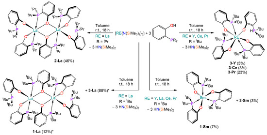 The proligands 2-di-tert-butylphosphinophenol and 2-di-isopropyl-phosphinophenol were synthesised in good yields (62% and 64% respectively) by minor modification of previously reported methods [42]. In order to target [RE{R2P(C6H4)O}3] complexes, we reacted the proligands with selected RE tris-amides [RE{N(SiMe3)2}3] (RE = Y, La, Ce, Pr, Sm) in a 3:1 stoichiometric ratio. The outcome of the reactions varied significantly depending on the RE metal employed (Scheme 1). From the reaction between [La{N(SiMe3)2}3] and the proligands, i.e., 2-di-tert-butylphosphinophenol or 2-di-isopropyl-phosphinophenol, dimeric, homoleptic complexes [{La[R2P(C6H4)O]2[µ2-R2P(C6H4)O]}2] (1-La: R = tBu; 2-La: R = iPr) were obtained. Conversely, the heaviest Ln metal studied, Sm, afforded the target homoleptic complex [Sm{tBu2P(C6H4)O}3]. Interestingly, analogous species could not be obtained when performing the same reactivity with Y, Ce and Pr, as, in these cases, complexes of general formula [RE{tBu2P(C6H4)O}3{tBu2PH(C6H4)O}] (3-RE; RE = Y, Ce, Pr) were isolated, which incorporate the phosphonium-aryloxide ligand {tBu2P+H(C6H4)O−}. Complex 3-Ce could not be isolated in pure form, as it could not be separated from co-crystallised free ligand and [Ce{N(SiMe3)2}3]. Additionally, when reacting [La{N(SiMe3)2}3] with 2-di-tert-butylphosphinophenol in an attempt to synthesise 1-La, a 1H and 31P{1H} NMR analysis of the crude reaction mixture showed that more than one species was present (Figure S46). Therefore, from the crude reaction mixture, compound [La{tBu2P(C6H4)O}3{tBu2PH(C6H4)O}] (3-La) was recrystallised from toluene, as confirmed by X-ray crystallography. Similarly, [Sm{tBu2P(C6H4)O}3{tBu2PH(C6H4)O}] (3-Sm) was obtained from fractional crystallisation during the synthesis of 1-Sm. All complexes were authenticated using single crystal X-ray studies (vide infra) and further analysed via multinuclear NMR spectroscopy, IR spectroscopy and elemental analysis.