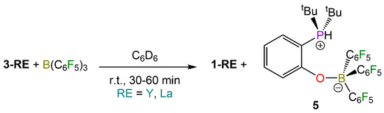 Reactivity of 3-RE (RE = Y, La) with B(C6F5)3 and formation of 1-RE and 5.