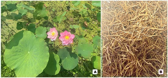 Nelumbo nucifera Gaertn., an example of a medicinal plant and traditional medicinal recipe: (A) N. nucifera medicinal plants in their aquatic natural habitat; (B) Thai traditional medicinal recipe made from the dried stamens of N. nucifera. All photos are taken by Assoc. Prof. Dr. Duangjai Tungmunnithum.