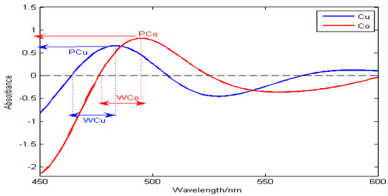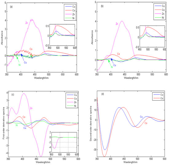 Figure 2b shows the spectral signal pretreated by the adaptive wavelet threshold method, which is used to eliminate random noise during instrument measurement and improve the accuracy and repeatability of detection. Figure 2c shows the first-derivative spectra by the continuous wavelet transform. The Haar wavelet is used to approximate the derivative of the original spectral signal. When the wavelength is greater than 500 nm, the derivative spectra of Zn and Ni are close to zero, thus shielding the interference from Zn and Ni. In addition, the overlapping spectral signals of Cu and Co begin to separate, especially the characteristic information of Cu begins to stand out. In some wavelength bands, the absorbance of Cu is greater than that of Co, which is no longer completely covered by the cobalt signal, but the sensitivity of copper in the whole band is still low. Figure 2d shows the second-order derivative spectra obtained by the continuous wavelet transform. The overlapping signals of Cu and Co are obviously separated. In the wavelength range of 520–550 nm, the spectral peak of copper is completely exposed and is no longer covered by the cobalt signal, and the sensitivity is significantly improved. Therefore, the second-order derivative spectra can separate the overlapping signals of Cu and Co, reduce mutual interference, highlight the spectral peak information significantly, and especially improve the sensitivity of copper.